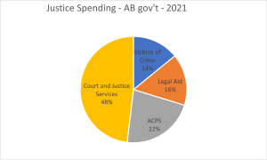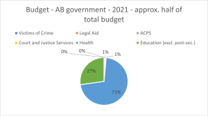 Looking at Alberta’s provincial budget alone; its health budget is $22 billion next year (p. 127) – more than a third of its total budget. Education is $8.4 billion (p. 131) – not including post-secondary. Its funding of Crown prosecution service (ACPS) is $99 million (includes prosecutors, already well-paid, who received a significant and well-deserved pay bump recently; note, it does not include federal prosecutors for drug offences) – 3 times what LAA paid for adult criminal roster counsel, $63 million for “Victims of Crime and Public Safety Fund” (almost twice what LAA paid for adult criminal roster counsel), some $215 million for Court and Justice Services (judges who are paid approximately $0.5 million each per year if you include pension, etc. which is apparently not enough; note 13 new Alberta judges appointed just recently – possibly includes Legal Aid) – a 10% increase from the last year (p. 137), for a total of a whopping $1.48 billion for the justice system (also includes exorbitant amounts to police and prisons – provincial only; as an aside, the $0.5 billion the province spends on police is separate from the other $0.5 billion spent by the City of Calgary alone on its police services). A mere $31 million spent by LAA on roster counsel for adult criminal certificates, and $42 million on total roster (includes family, immigration, youth criminal, etc.). The total of $42 million spent on legal aid certificates is down a shocking 40% from the year before. I will put some charts below.
